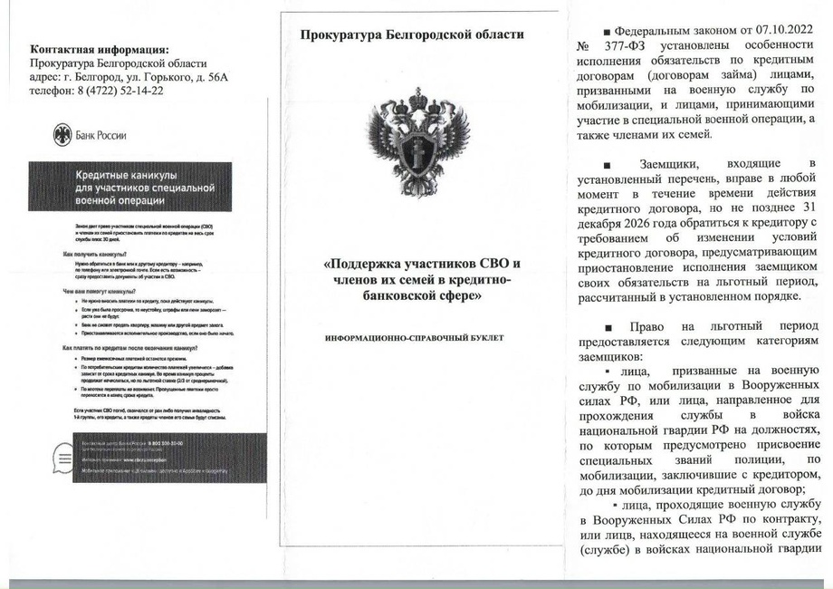 ❗ Важная информация Уважаемые вейделевцы, прокуратура Белгородской области подготовила информационно-справочный буклет «Поддержка участников СВО и членов их семей в кредитно-банковской сфере». В буклете собрана актуальная информация о мерах поддержки, льготах и возможностях, которые доступны участникам специальной военной операции и их близким при взаимодействии с кредитными организациями.